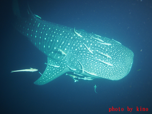 大きいです! 優に体長6mくらいはありました。まずはボートの上から観察です、ジンベイが慣れてきたら3点セットをつけて静かにエントリーすると手の届く距離まで何度も何度も近寄ってくれました。終わってみれば1時間以上もダイバーと遊んでくれました。かなりラッキーな夜だったようです。
