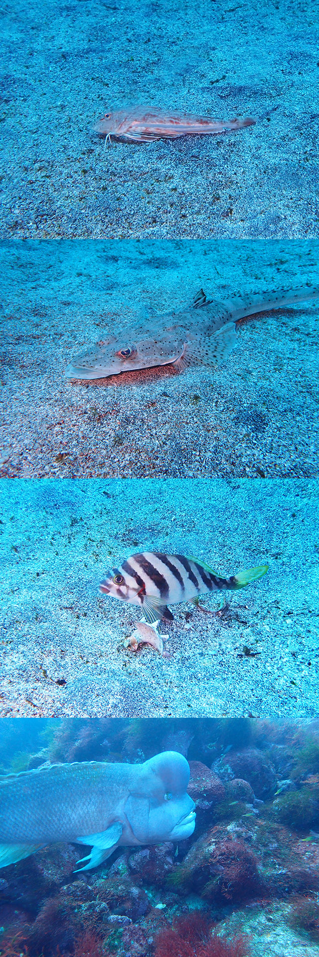 ダイナミックな地形を楽しみながら、シラコダイやイサキの大群に囲まれているとアオウミガメが登場! 残念ながら画像はありませんが、後日動画をアップします。