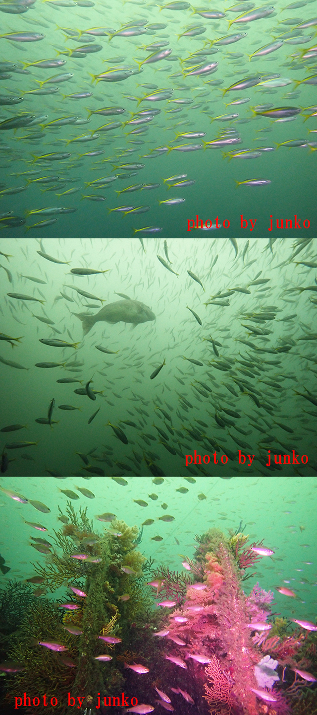 相変わらずお魚がグッチャリの沈船まわり。中層にはタカベやアジの大群がみっしりと群れています。